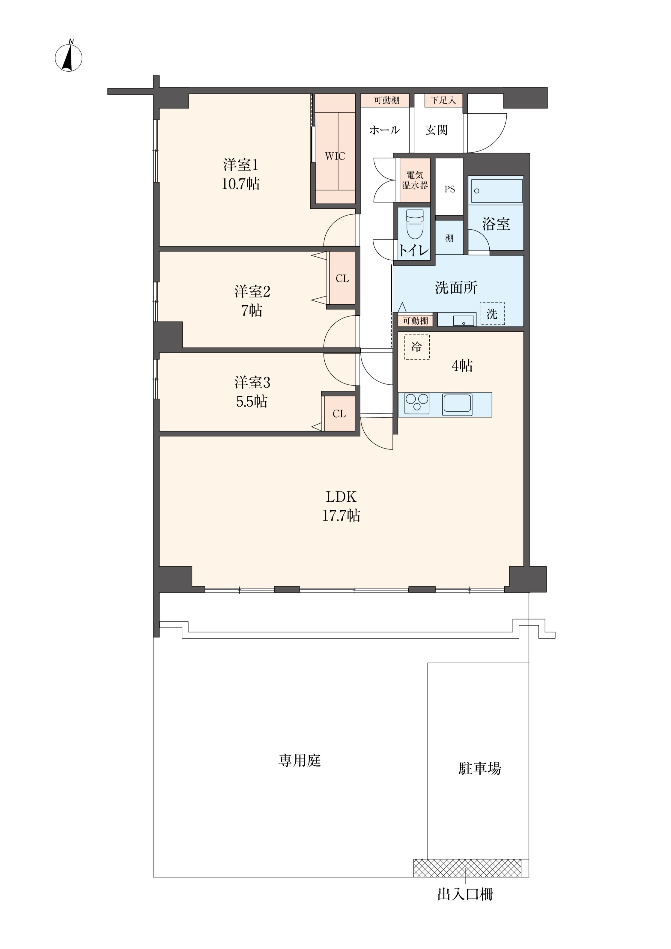 専有面積107m² ✕ 77㎡プライベートガーデン ✕ 南角部屋|庭に駐車場を備えた平屋感覚の邸宅